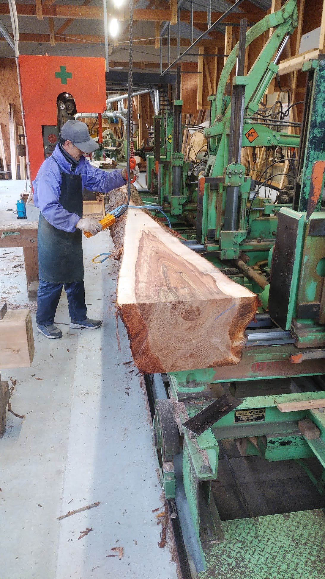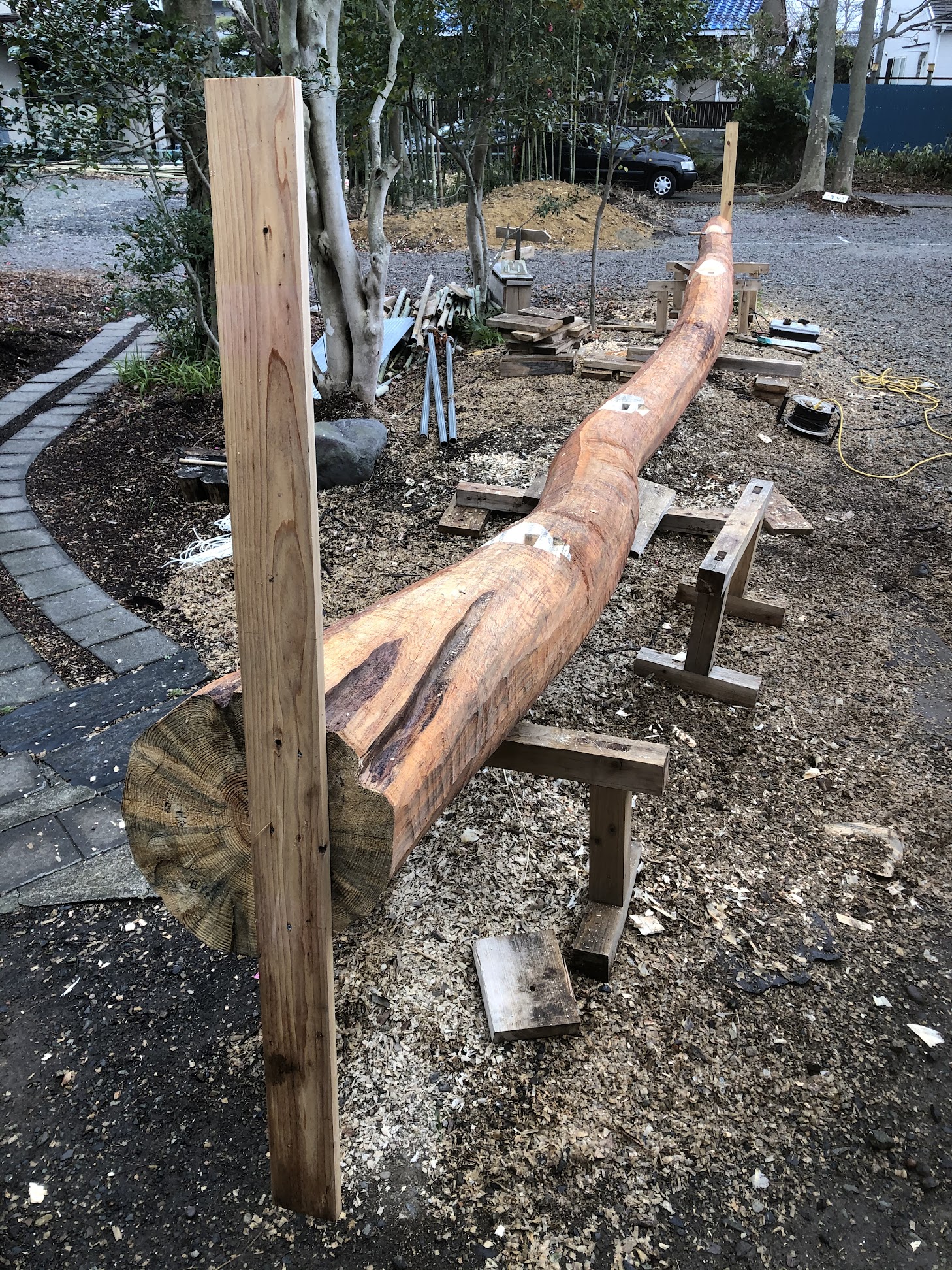 また使える状態の赤松が一本だけあり、それを建物の横方向で梁として使うため 11m。これは版築壁の上に横たわっています。そして現地の道路事情からこの⾧さの材を搬出することが不可能なため、ここでハツリ、墨出し、刻みを行っています。奥にある井戸の横には、立ち枯れた大きな栗の木がありました。通常、建築で立ち枯れたものは中の痛みがあったりするので使わないのですが、この栗の木は倒してみたところ十分使えそうでしたので、製材所へ。曲がり、入り組んだ形でしたので中心部分から半分に割り、入り口の扉両脇に立てることに。