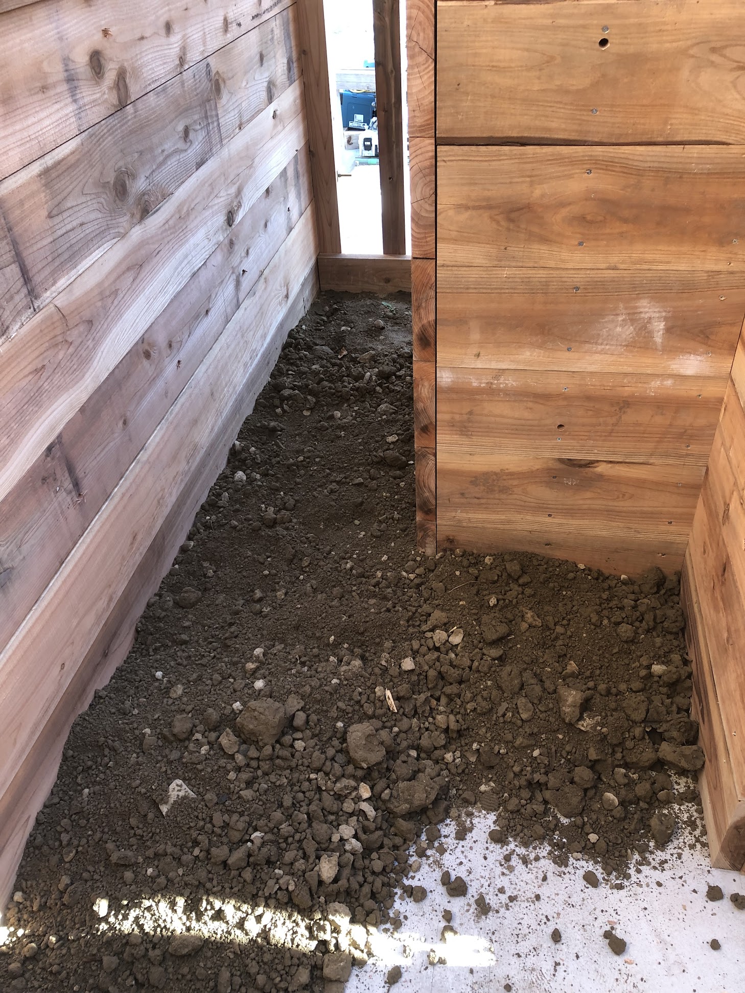 最後に残った作業が土間の三和土(たたき)でした。これは版築に使った土と同じ配合の物に、石灰とにがりを配合しています。砂利で 10cm程かさ上げした上に 15 ㎝程の厚みになるように三和土の土を入れて締め固めています。最後はノロを鏝で押さえて仕上げて頂きました。この土間部分は地面との間をコンクリートなどで遮断せず、地面の湿気なども上がるようになっています。