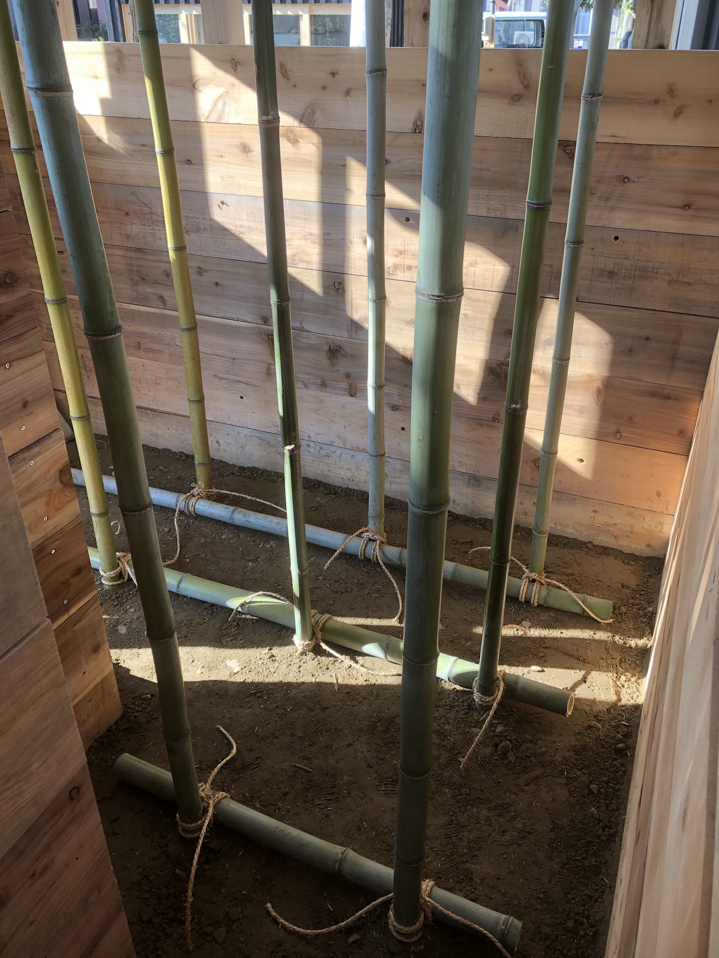 版築壁は基本土の塊ですが、耐震性を向上させるために中に竹の骨組みを入れています。下から 10 ㎝程上がった所から縦方向の竹を立てます。間隔は 50 ㎝程で人が間をやっと通れるくらいです。横方向にも竹が入ります。下から 80 ㎝程度と 150 ㎝程度の箇所に、それぞれ90度向きを変えて2段ずつ入ります。この横方向の竹を縦方向の竹と縄で結びます。このことによって縦と横の骨組みがつながり、全体的な強度が出ます。