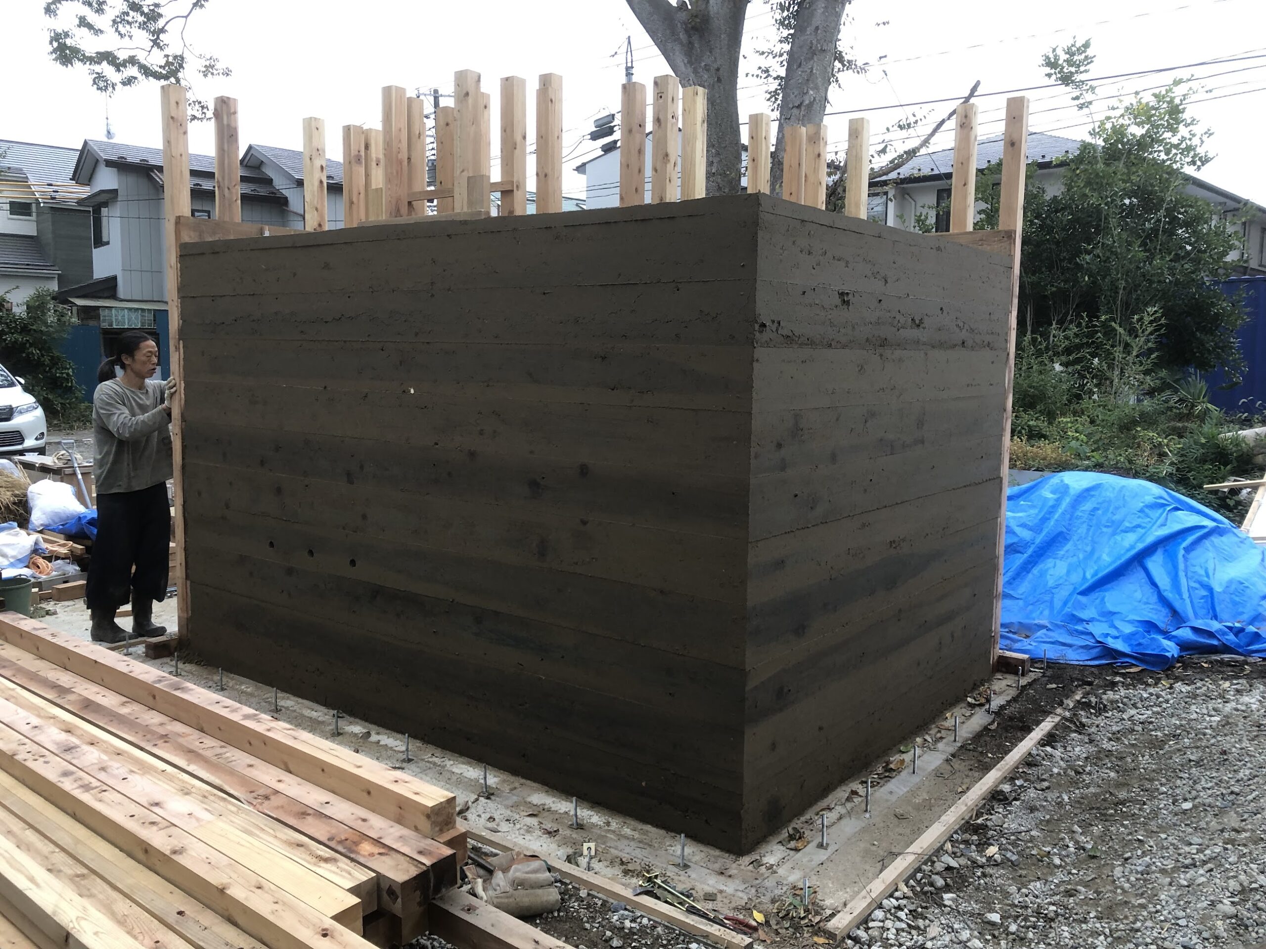 版築とは古来からある強固な壁面や地盤を作る手法で、世界各地にみられます。古くは万里の⾧城などの城壁や、奈良、京都などで見られる築地塀もこれに似たものです。社寺建築の基礎(基壇)などの作りにみられ、千年以上にわたり不当沈下の無い安定した地盤が得られること、また近年まで河川堤防などでも同じような手法で作られていたことが記録にあります。日本では住宅などの建築であまり例を見ることはありませんが、今回は千葉県にある土太郎村の中島健一郎様のご自宅や、建築家である遠野未来さんの事例などを参考とさせていただきました。