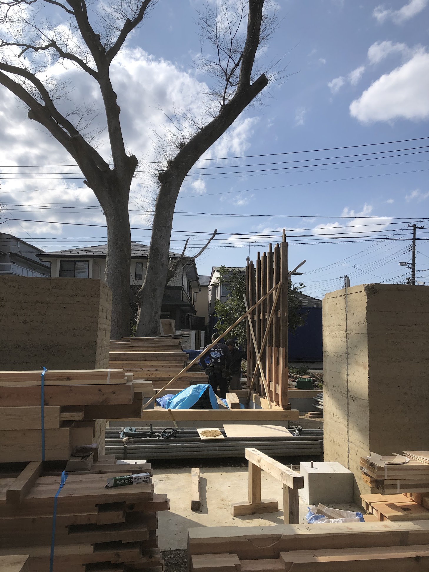 今回の版築は標準の壁厚 1.2m(一部 60 ㎝)、高さ 2.2m(耐圧盤コンクリート面より)となることから、相当の土圧が生じると考えられ、そのために十分な木枠とする必要があります。コンクリート面に周囲土台をアンカーボルトで止め、その内側に 9 ㎝角の柱、そして枠板には杉の 4.5 ㎝厚の物を使っています。この枠板はギャラリーの二層になった上部の屋根板として再利用しています。柱頭頂部を同じ 9 ㎝角材で緊結し完成。