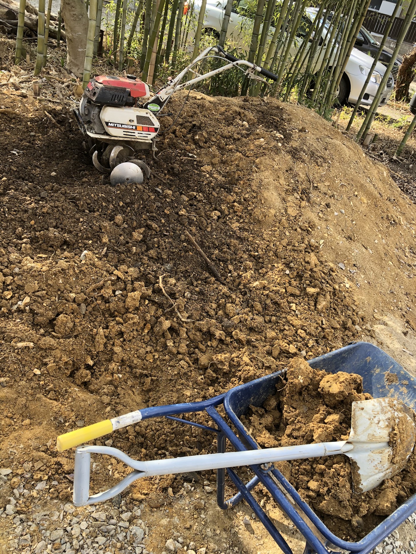 採取場で重機によりあらまし攪拌してあるものを、現場で再度耕運機を使い細かく攪拌。砂もこの時点で入れます。この際に土をしっかりと乾かす事が仕上がりの状態を決める事となり、天候に左右されます。また今回は土の元々の成分に石灰質が多く含まれていることから、追加の石灰は入れていません。