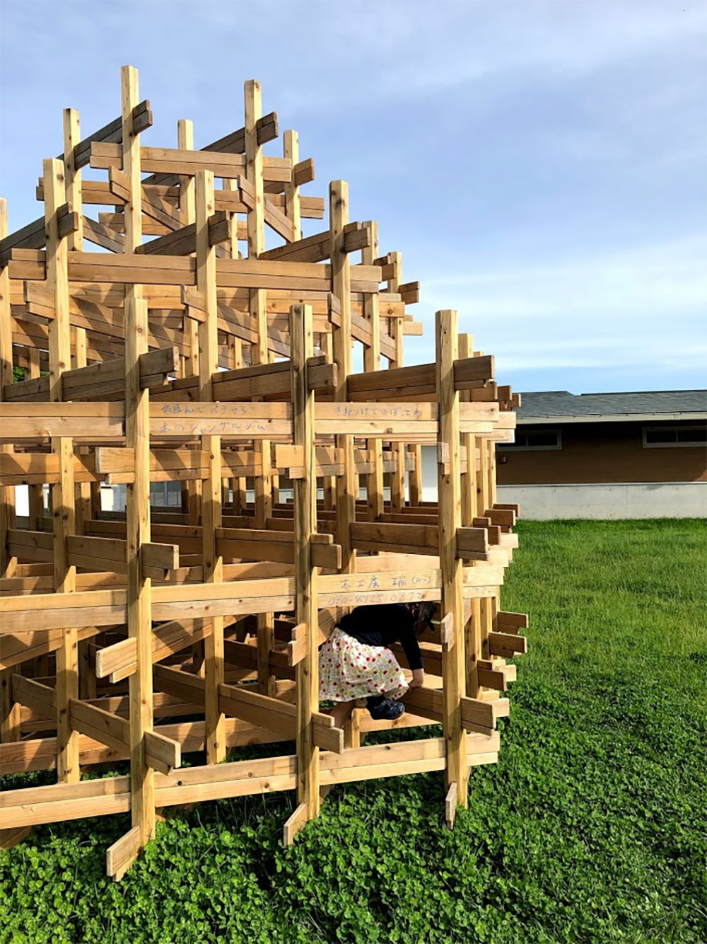 施工実績「宮城県産材を使用した「組んでバラせる木のジャングルジム」です。 親子で参加できて、組み立て時間は30分! イベント終了後には簡単にバラせて軽自動車に積載可能! オーダーで様々なサイズ作成できます。 レンタルあり。 その他宮城県産の杉を使った滑り台なども作成しております。」
